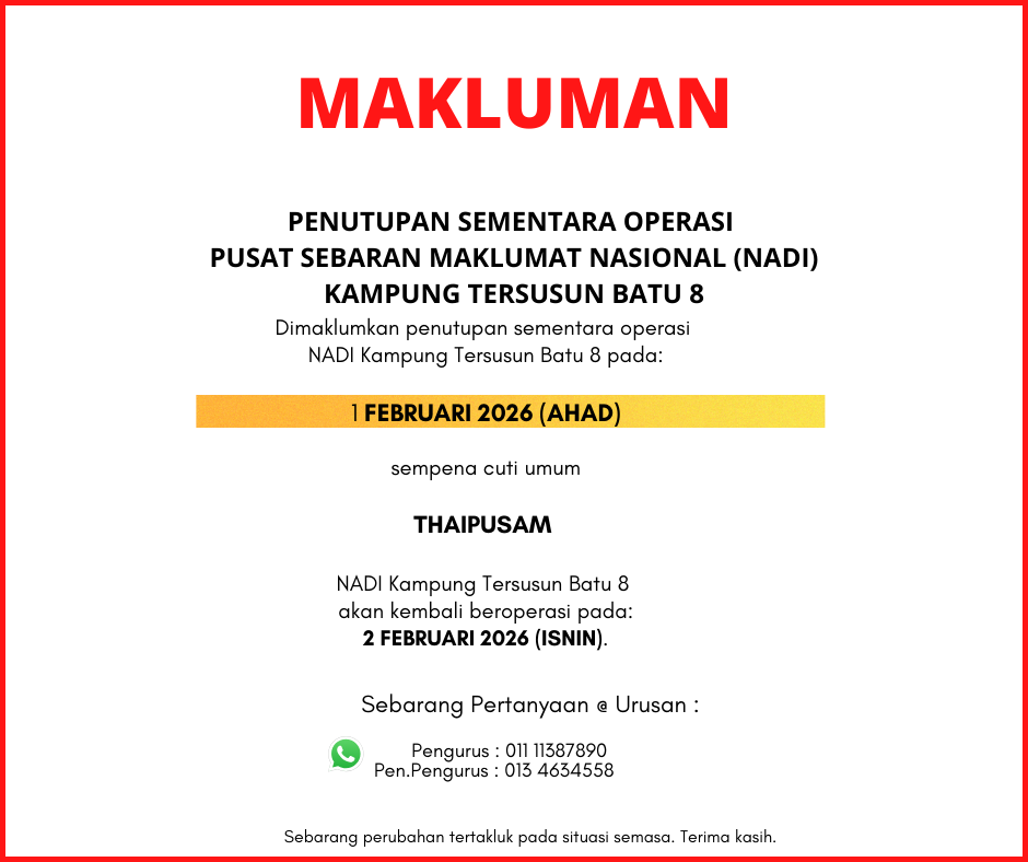 SEKITAR BAZAR RAYA NADI KAMPUNG TERSUSUN BATU 8 Bazar Raya NADI Kampung Tersusun Batu 8 yang telah berlangsung pada 14 Mac 2026 berjalan dengan meriah dan mendapat sambutan yang amat menggalakkan daripada komuniti setempat. Pelbagai aktiviti menarik telah dianjurkan antaranya […]