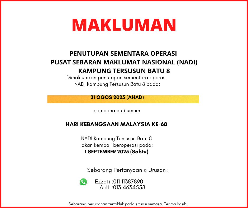 𝐏𝐫𝐨𝐠𝐫𝐚𝐦 𝐊𝐡𝐚𝐬 𝐌𝐞𝐫𝐝𝐞𝐤𝐚 & 𝐇𝐚𝐫𝐢 𝐌𝐚𝐥𝐚𝐲𝐬𝐢𝐚 @𝐍𝐀𝐃𝐈 𝐓𝐚𝐫𝐢𝐤𝐡: 𝟕 𝐒𝐞𝐩𝐭𝐞𝐦𝐛𝐞𝐫 𝟐𝟎𝟐𝟓 (𝐀𝐡𝐚𝐝) 𝐌𝐚𝐬𝐚: 𝟏𝟎.𝟎𝟎 𝐚𝐦 – 𝟒.𝟎𝟎 𝐩𝐦 𝐓𝐞𝐦𝐩𝐚𝐭: 𝐍𝐀𝐃𝐈 Kg Tersusun Batu 8 Setinggi-tinggi ucapan terima kasih kepada semua yang terlibat bagi Program Khas Merdeka & Hari Malaysia NADI […]